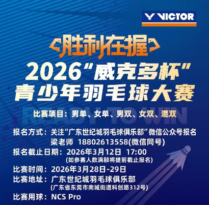 4、联席会议:2026年3月27日16:00线上召开领队、教练员联席会议,会议链接将在“威克多杯”青少年羽毛球大赛赛事官方微信群公布。