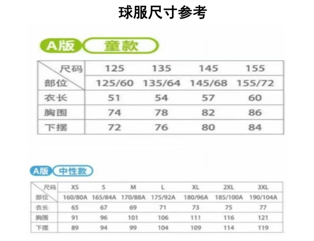 (6)请根据服装尺寸表填写运动员服装码数,未填信息或错填将随机赠发服装。